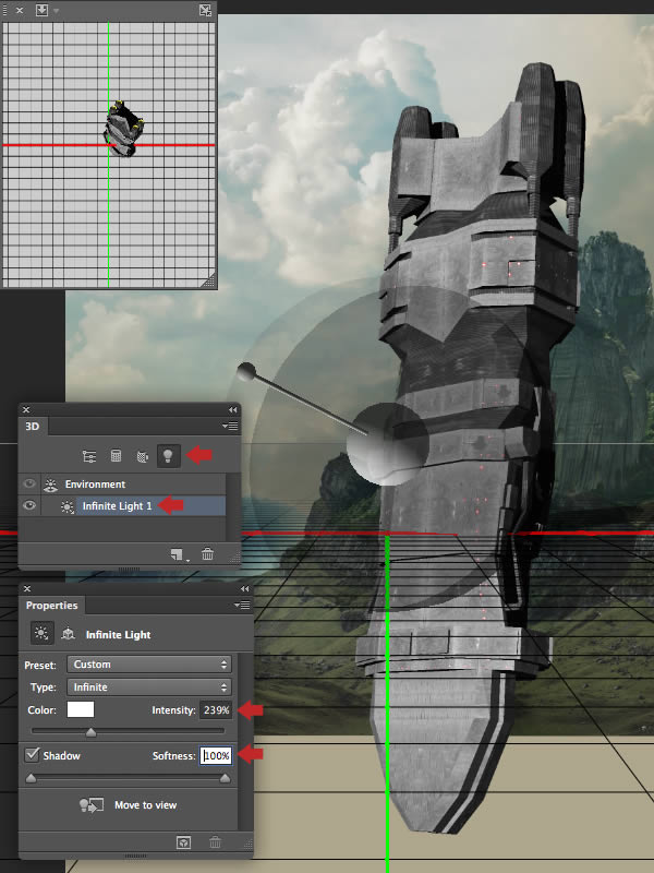 Select the Group Mesh in the 3D panel, then move and rotate the object as shown. Now select Infinite Light 1 in the 3D panel, drag it to match the top-left lighting in the scene, then modify the Intensity to 239% and the Shadow Softness to 100%.