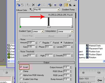 Now go to the other sub material 2, and put a Gradient Ramp in its Diffuse. Animate the ramp in linear from left to right in such a way that a strip of black color must travel through the white until the 80th frame. Also make it invert in the “Output” panel.