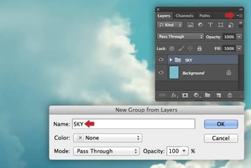 Highlight the Selective Color adjustment layer thumbnail, then Shift-click to highlight the "Clouds 1" layer thumbnail (this will highlight the in-between layers too). Now choose New Group from Layers from the top-right fly-out menu and name it "SKY" in the following window.