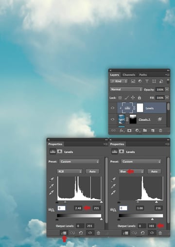 Clip a Levels adjustment to the same layer and modify the RGB and Blue sliders as shown.