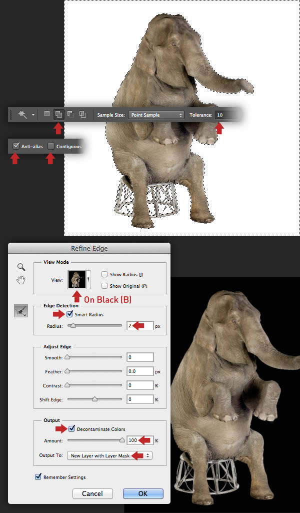 Click the Refine Edge button in the Options bar and in the following window choose On Black (B) from the drop-down menu to give the best preview of removing the background. Now set the Smart Radius to 2px, the Decontaminate Colors to 100% and choose Output to New Layer with Layer Mask from the drop-down menu.