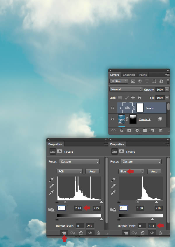 Clip a Levels adjustment to the "Clouds 2" layer and modify as shown.