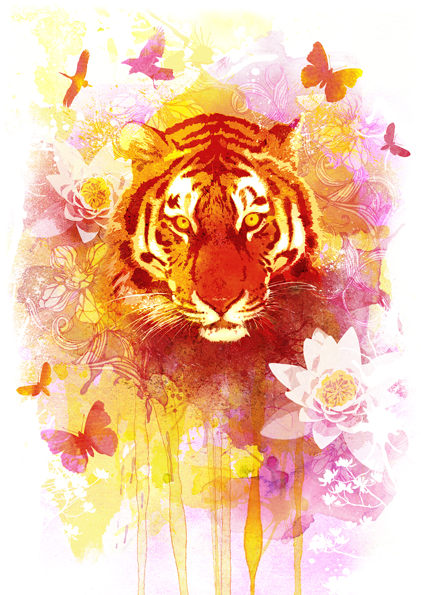 Add a layer above all the folders, then select the Clone Stamp Tool. Set it to sample using Current & Below and also to include the adjustment layer; now fix any areas you're unhappy with – I worked over the dark areas just below the tiger's chin. I also ran the Dodge Tool (O) over his snout and chin on the "Tiger lighten" and "Tiger vivid light" layers. To wrap things up, adjust any layer Opacities/Modes until you're happy, then it's finished!