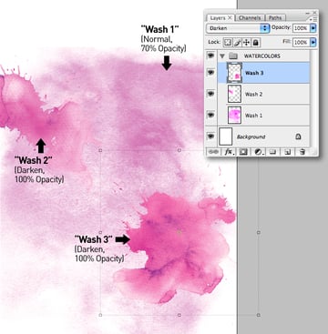 Drop in "Watercolor_2.jpg" and "Watercolor_3.jpg," setting their Blending Modes to Darken, then add all three layers into a group folder called "WATERCOLORS."