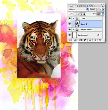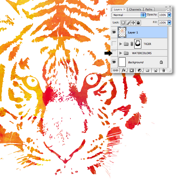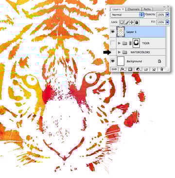 Revisit your "WATERCOLORS" folder and add masks to selective layers, then use a variety of soft-edged brushes on the darker overlapping areas to reveal any hidden detail in the tiger.