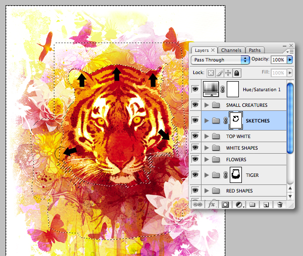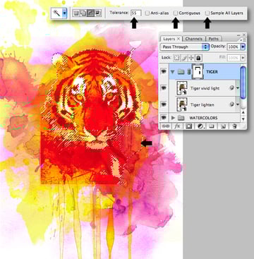 Target the "Tiger vivid light" layer again and use the Magic Wand Tool (with Contiguous unchecked) to select the pale orange areas. Now target the folder mask and use a medium, soft-edged brush to hide the right-hand areas as indicated.