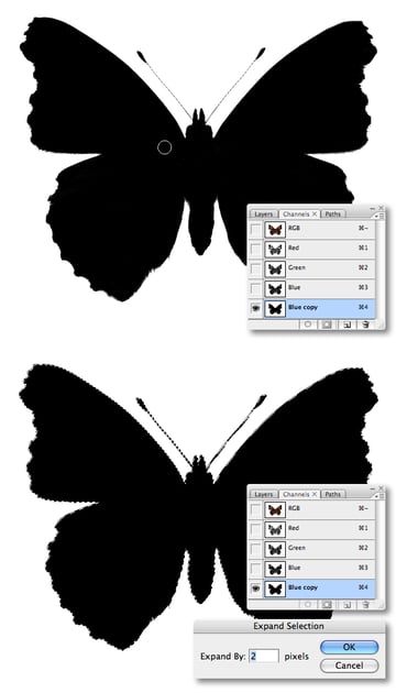 Use a small, hard-edged brush to fill the remaining white areas within the butterfly. Generate a selection from the channel, inverse it, then go to Select > Modify > Expand and enter 2 px. With the selection still active, switch to your layers palette, fill with white and Copy.