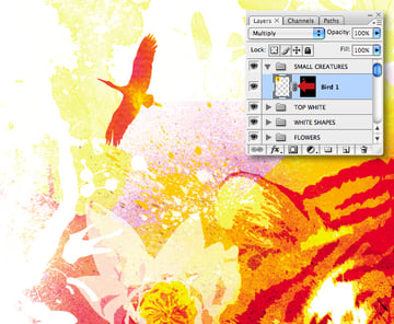 Choose and target one of the layers in the "WATERCOLORS" folder (I used "Wash 14"), then Select All and Copy. Now target the temporary layer and Command-click its thumbnail to generate a selection. Next, go to Edit > Paste Into (Shift + Command + V). You can now name the resulting layer "Bird 1" and delete the temporary one.