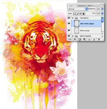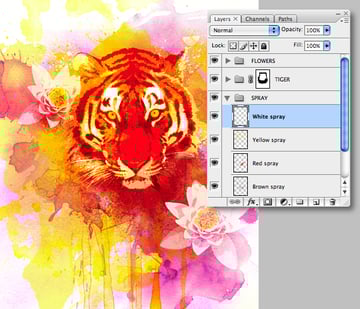 Add a new folder beneath the "TIGER" and label it "SPRAY;" drop a new layer within the folder and name it "Brown spray." Now use the Eyedropper Tool (I) to sample a dark brown from your image, then use your new brushes to add a few selective areas of spray – don't forget to rotate and flip your brushes to avoid repetition. We're only after a subtle effect here, so don't get too carried away. Now set the Blending Mode to Multiply and adjust the Opacity to taste – I used 56%.