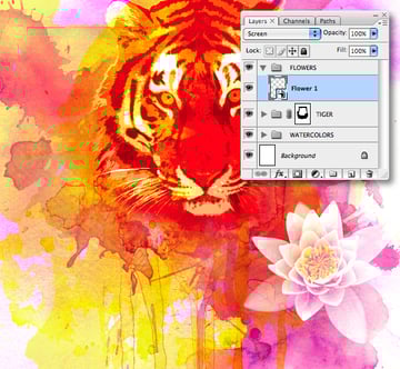 Add a new folder called "FLOWERS," then Paste the selection into the folder as a layer and label it "Flower 1." Now convert the layer to a Smart Object and Transform/position to the right, setting the Blending Mode to Screen.