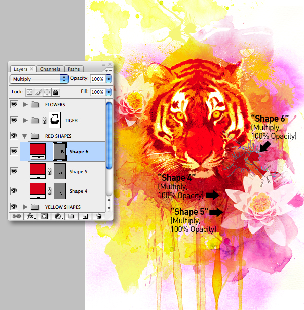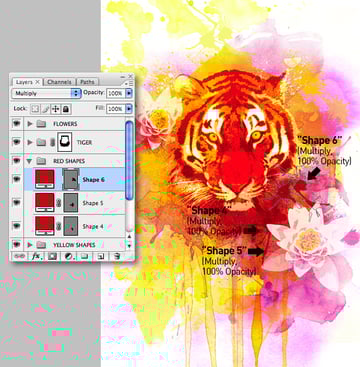 Add a new folder labelled "YELLOW SHAPES" below the "TIGER." Pick a pale yellow as your foreground color, then set the Custom Shape Tool (U) to Shape Layers and begin adding your shapes within the folder. Now set their Blending Modes to either Multiply or Darken as shown. Also, feel free to Transform the shapes as required.