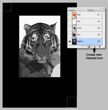 We now need to store a copy of the tiger within an extra channel. But because both tiger layers contain transparent information, a straight Copy > Paste will not align. A work around is to add two temporary black fills extending to the canvas edges on the "Tiger vivid light" layer.