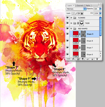 Following the same method, add some red shapes in Multiply mode within another folder called "RED SHAPES."
