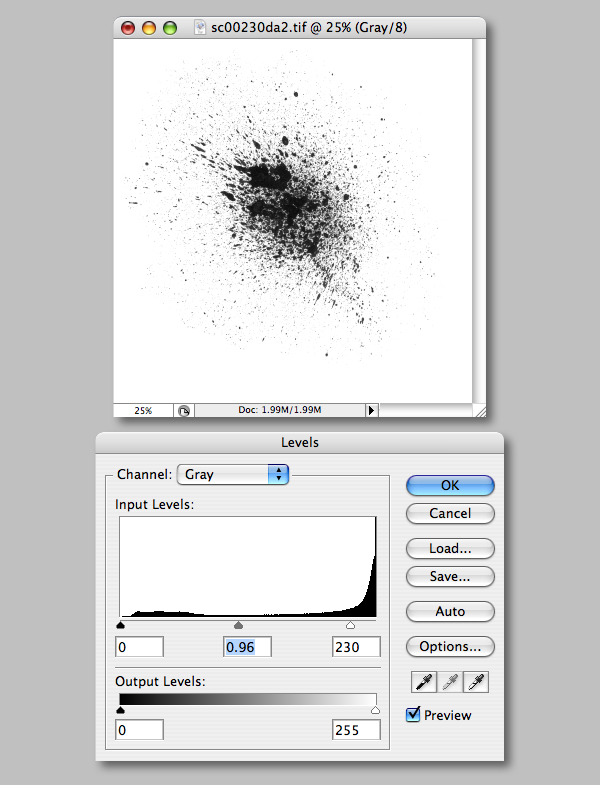 For those who want to create your own brushes, start by opening your first spray image and carry out a Levels adjustment (Command + L), making your whites brighter and blacks denser.