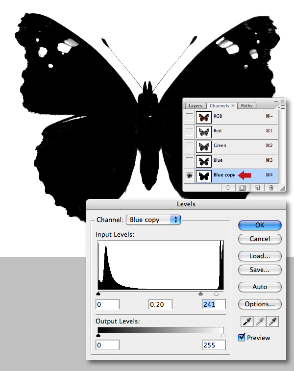 Next, we'll create a density mask; switch to your channels palette and cycle through each one in turn to determine the one with the most contrast between insect and background – in this case it's the Blue channel. Duplicate it by dragging its thumbnail into the Create new channel icon. Now add a Levels Adjustment to the channel as shown.