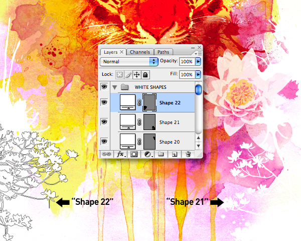 Add a new folder above the "FLOWER" folder and label it "WHITE SHAPES." Set your foreground color to white and begin to add more shape layers into the folder to frame the edges, apart from the base – where the paint drips off the canvas.