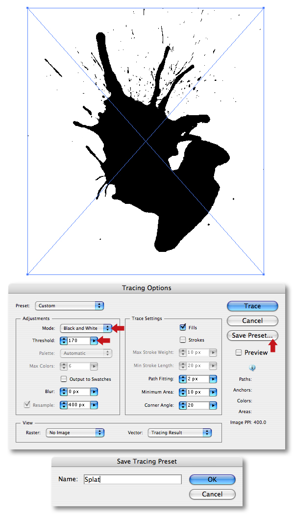 Launch Illustrator and create a new document. Go to File > Place and navigate to your first ink/straw scan. Next, go to Object > Live Trace > Tracing Options, ensuring the default Black and white Mode is selected. Now increase the Threshold to 170, then save your setting by clicking on the Save Preset button.