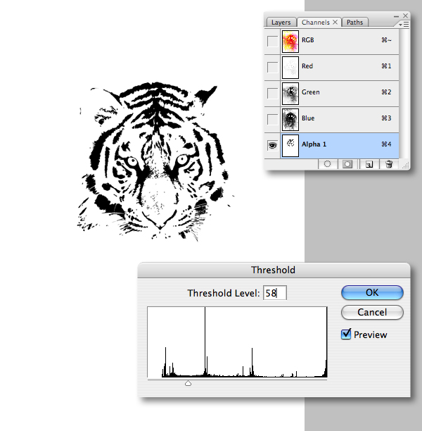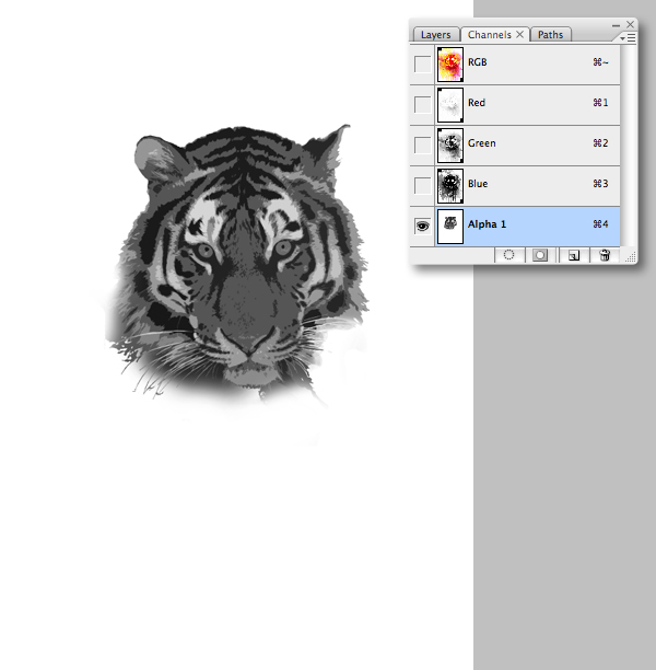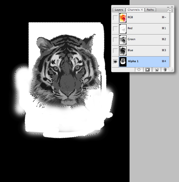 Switch to your layers palette and Command-click the "TIGER" mask thumbnail to generate a selection, then switch back to your channels palette. Target "Alpha 1" and hit Shift + Command + I to inverse the selection. Next, ensure black is set as your foreground color and hit Delete to fill the active selection with white.