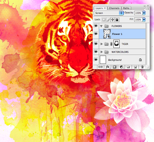 Duplicate the "Flower 1" layer, then go to Edit > Transform > Flip Horizontal. Now resize and position to the left, just below the tiger's ear setting the Blending Mode to Hard Light. Add a mask, then generate a selection from the "TIGER" mask thumbnail and paint within the selection on the mask to hide the overlap flower area.