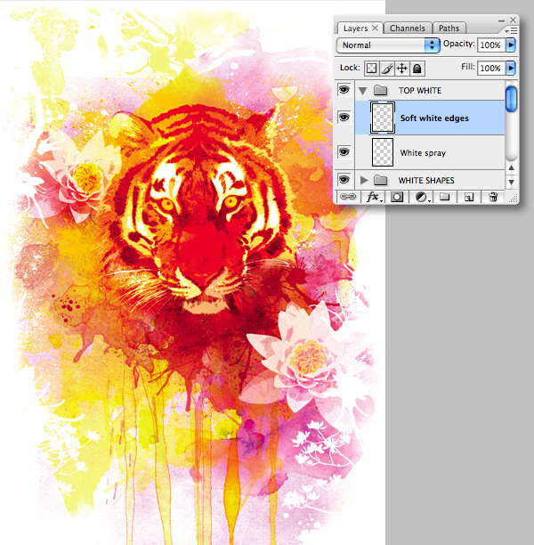 Add two further spray layers, one using a sampled yellow and another using white. Both these layers should have the default Blending Mode (Normal) and Opacities (100%).