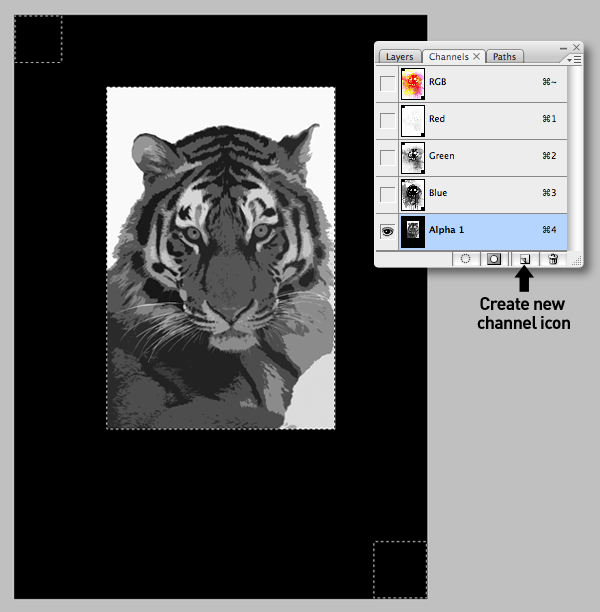 With the "Tiger vivid light" layer targeted, Select All and Copy. Now switch to your channels palette and click on the Create new channel icon and Paste the selection into the new channel.