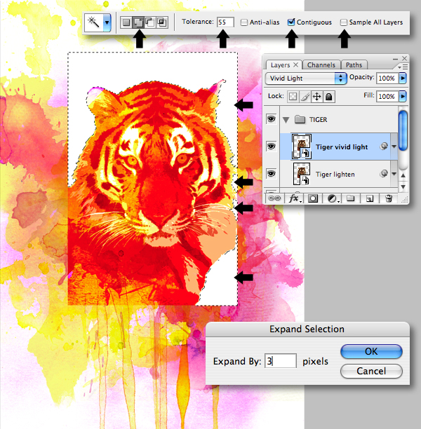 Target the "Tiger vivid light" layer, then set the Magic Wand Tool (W) to a Tolerance of 55 with Contiguous checked. Now click to select the outer white areas and go to Select > Modify > Expand by 3 px.