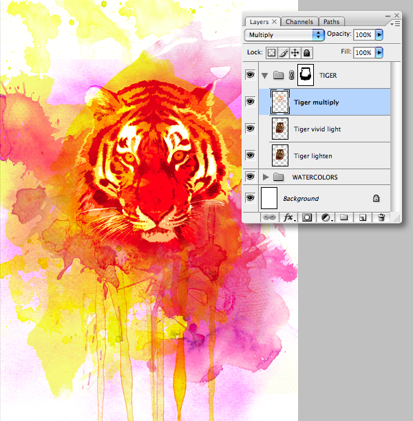 Drag this composite layer into the "TIGER" folder, set the Blending Mode to Multiply and label it "Tiger Multiply."