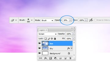 Erase some of the scattered light that the Lens Flare effect produces with an Eraser Brush set at the size of 300 and Opacity of 34%.