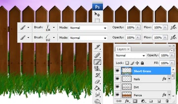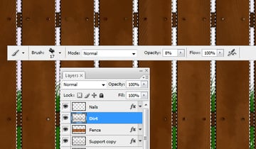 Our fence is old, so it would look better if there was more dirt on it. So using a brush draw in dirt, dust, and stains. I've used the brush that had an Opacity of 8%. Do not add too much, but just enough to make it look more realistic.