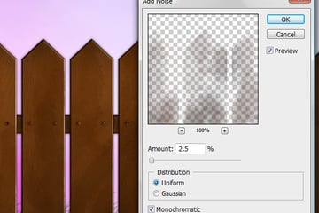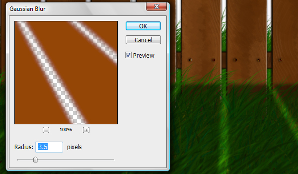 Apply a Gaussian Blur of 3.5 pixels to the layer by going to Filters > Blur > Gaussian Blur. Set the Opacity of the layer that is now the shadow on the ground to 30%. Make the other black fence layer visible now. Also, set the Opacity of the layer to 30%. Use the Gaussian Blur of 3.5 pixels on this shadow as well.