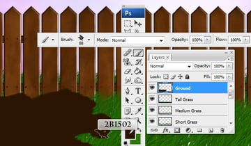You might have spots of white between the grass. To fix that we'll add a "Ground" layer. Make a new layer and color it dark brown (#2b1502) covering the entire bottom part of the image where the ground should be. Then move the layer behind all the grass layers. You can see the result in the second image below.
