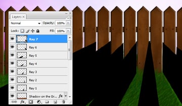 Using the Pen Tool, draw in the rays of light coming through the fence. After drawing each one, right-click and select Fill Path. After it has been filled, right-click again, and select Delete Path. Each ray should be drawn on it's own layer. This is because we'll need to apply a Motion Blur to each one separately. The easiest way to get the path of the rays correct is to try to match them to the rays that are on the grass.