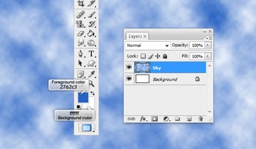 Next, we'll work on the sky. Open a new document. The dimensions are up to you, but making the image large would make the work easier. I chose the size to be 2000 pixels by 1200 pixels. Change the foreground color to a sky blue (2762c3) and the background color to white. Create a new "Sky" layer and apply the Cloud Filter by going to Filters > Render > Clouds.