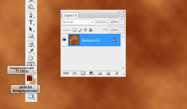Prior to starting to work on the image itself we need to make a wood pattern that we'll later use to make the fence. To do this, open a new document at 800 pixels by 800 pixels in size. Then set the background color to a light brown (I chose #de9650) and the foreground color to a darker brown (711f03). Then go to Filters > Render > Clouds to create the clouds, which is the basis of the wood pattern.
