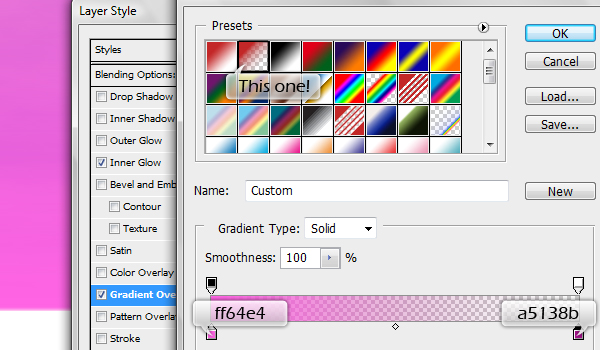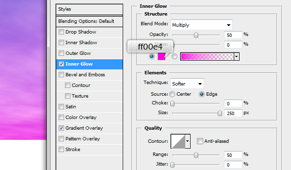 Now to create the sunset we need to apply a Gradient Overlay on the "Clouds" layer as well as give it an Inner Glow. For the Gradient Overlay I chose the Foreground to Transparent gradient and changed the colors to light pink (#ff64e4) at the Foreground end and to deep pink (#a5138b) at the Transparent end.