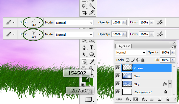 We'll work on the grass area next. Create a new layer. Then using the Paint Brush Tool, and one of the two grass brushes provided by Photoshop, draw grass on the horizon line. To make sure that the grass is not all one color, I used a dark green (#154502) as a foreground color and a light green (#2b7a01) as a background color. The result should be something like the second image below.