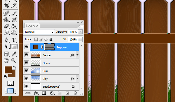 Now we need to make the two parallel pieces of wood that hold the fence up. To do this, draw two rectangles with the Shape Tool. They should be long enough to run across the entire length of the fence.