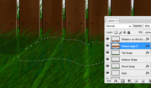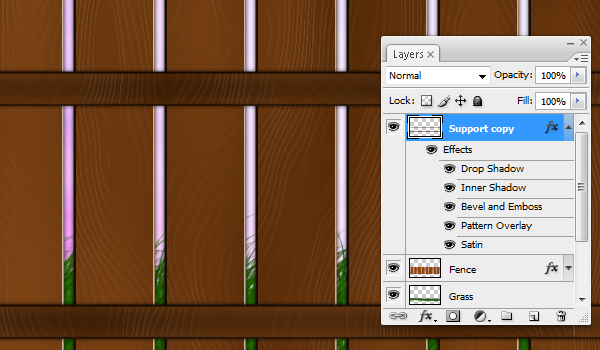 Then we need to copy the Layer Style of the Fence and paste it onto the layer that you have just created. In the Layers Window right-click on the Layer Effects of your Fence layer. Select Copy Layer Style and go over to the new layer, right-click on its name, and select Paste Layer Style. Now move the new layer behind the fence.