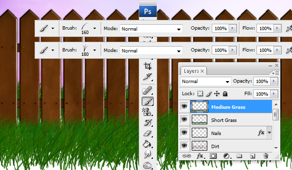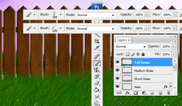 The second layer "Medium Grass" should be drawn with the 160 pixels and 180 pixels brushes. And the third and final layer "Tall Grass" should be drawn with the 230 pixels and 250 pixels brushes.