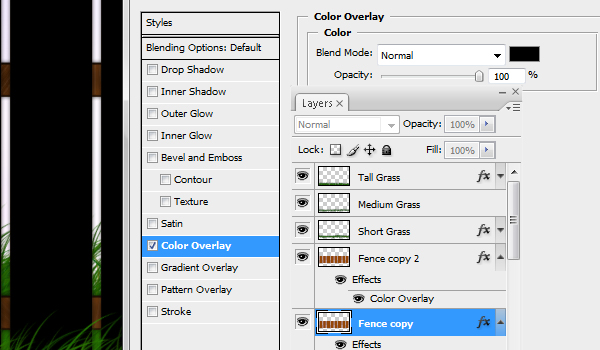 The last major part of the image is the light and how it shines through the fence. To create the first part of it you'll need to duplicate the "fence" layer. On that duplicated layer disable all the effects and add a Color Overlay of solid black.