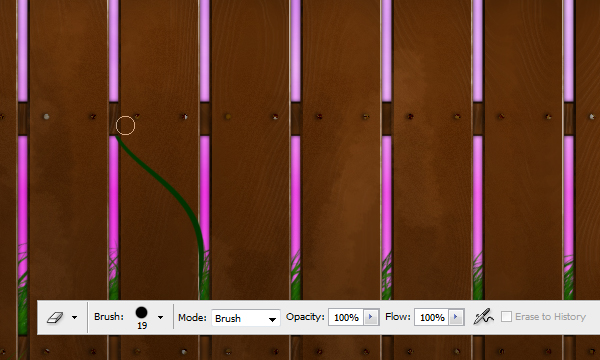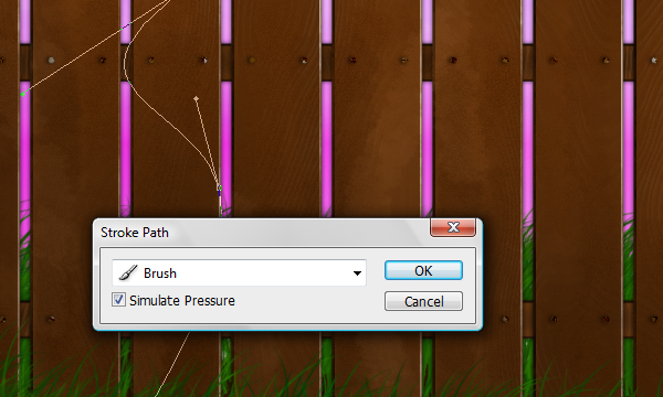 There is not an old forgotten fence without vines and of course flowers on it. To draw the vines we need to get a suitable Brush. Also, set the color to the same one that you've used to make the grass. Now select the Pen Tool from the palette and start drawing vines around the fence. When you are done drawing one of them, right-click with the Pen Tool, and select Stroke Path. In the window that will pop up select Brush and check Simulate Pressure
