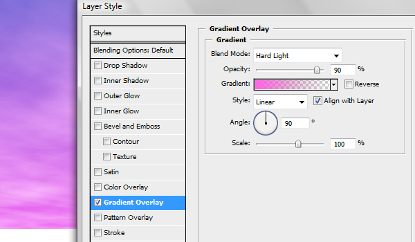 The style is Linear, the Angle is 90 degrees, and the Scale is 100%. Also, the Opacity should be 90%. For the Inner Glow set the blend mode to Multiply, the Size to 250, and the color to hot pink (#ff00e4).