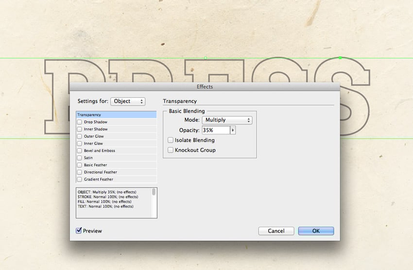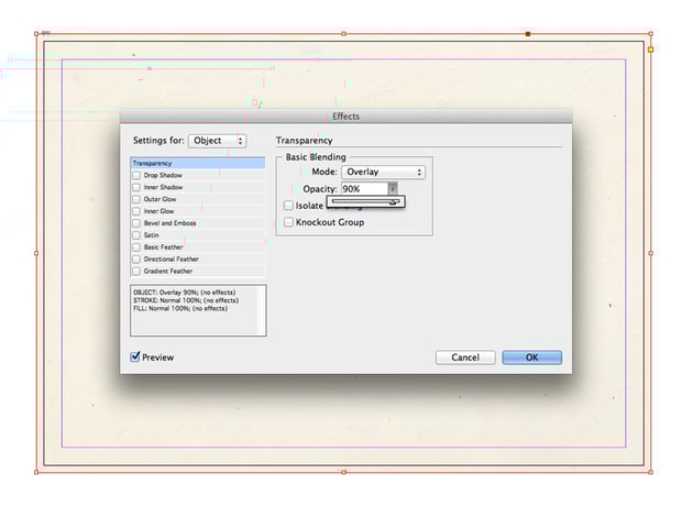 With the rectangle still selected, head up to Object > Effects > Transparency. Set the Mode to Overlay and bring the Opacity down to 90%.
