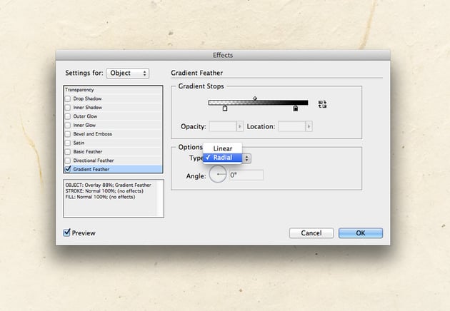 Click on Gradient Feather at the bottom of the panel’s left-hand menu. Choose Radial from the Type menu, and ensure the gradient extends outwards, getting more opaque towards the outer edges of the page.