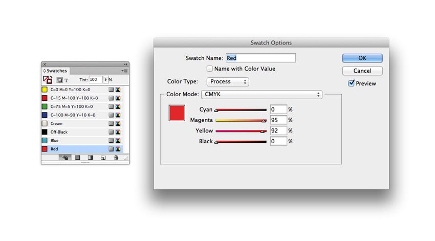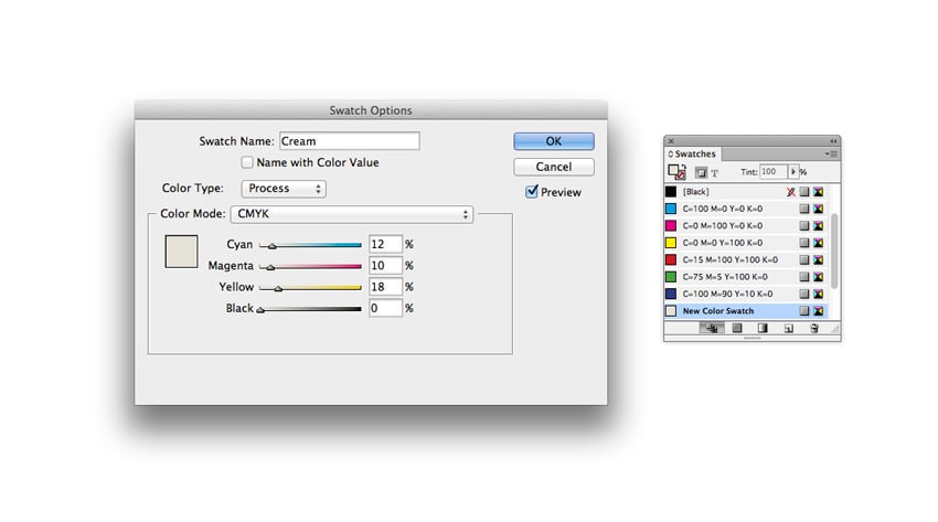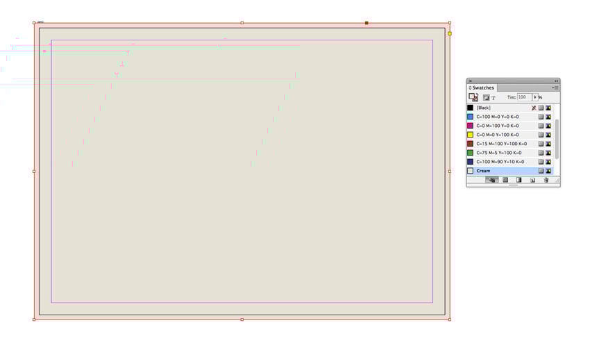 Expand the Swatches panel (Window > Color > Swatches) and create a new CMYK swatch. Name it Cream and set the levels to C=12 M=10 Y=18 K=0.