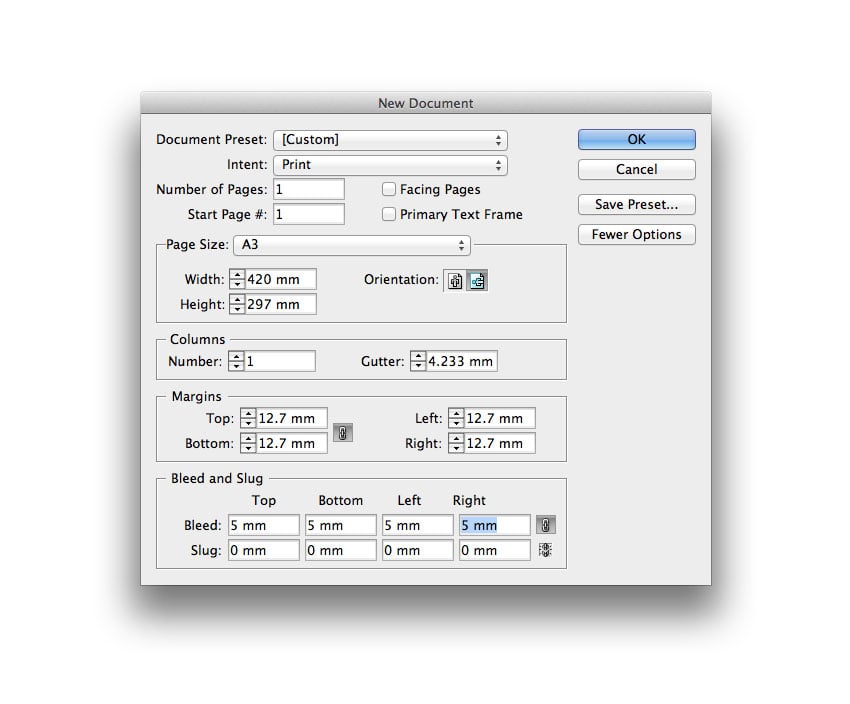 Open up InDesign and go to File > New > Document. You can create the type effect at any size you wish, but here I’m going to set up an A3 landscape page with the Intent set to Print.