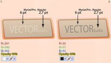 Select the Type Tool (T) and write "VECTORtuts." Duplicate this text once. Fill the original text with R=241, G=242, and B=242, then the duplication with R=35, G=31, and B=32 (the duplication must be places above the original shape in the Layers pallet). Follow the rest of the informations for the text in the images below, (don't forget to lower the Opacity for both text to 40%).