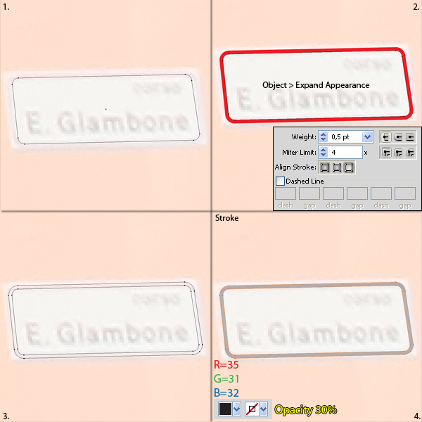 Duplicate "Part2" and fill this duplication with none. Add a 0.5pt Stroke for this shape. Align the stroke to the outside, then select it (from the Appearance pallet) and go to Object > Expand Appearance. Name this newly created shape "Stroke," fill it with R=35, G=31, and B=32, then lower its Opacity to 30%.