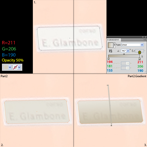 Select this new shape and "ZZZ," then click on Intersect from the Pathfinder palette. Select "Part.1" and the newly created shape (make sure it is placed below "Part.1" in the Layers pallet) and click on Minus Front from the Pathfinder pallet. Name this shape "Part.2" and fill it with R=231, G=217, and B=172. Duplicate "Part.2" twice, name them "Part.2.Gradient1" and "Part.2.Gradient2" and apply the gradients shown in the images below.