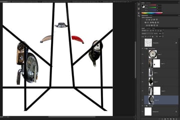 Now that you have your actions set up we can get to work. We are going to work on the individual components of our creation and give them a a coherent light source, add shadows and so on. When you want to work on a particular element, select its layer and press the play button in the Actions palette with your action selected and your layers should appear if you have set up the actions appropriately.